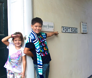 OK means nothing really – Ollie and Amy pointing at a road sign. This is the small road to Bleak House. Funny is that this very road is the road that takes us from the motorway to our road where we live of Tanjong Road. Fort Road it seems is global.