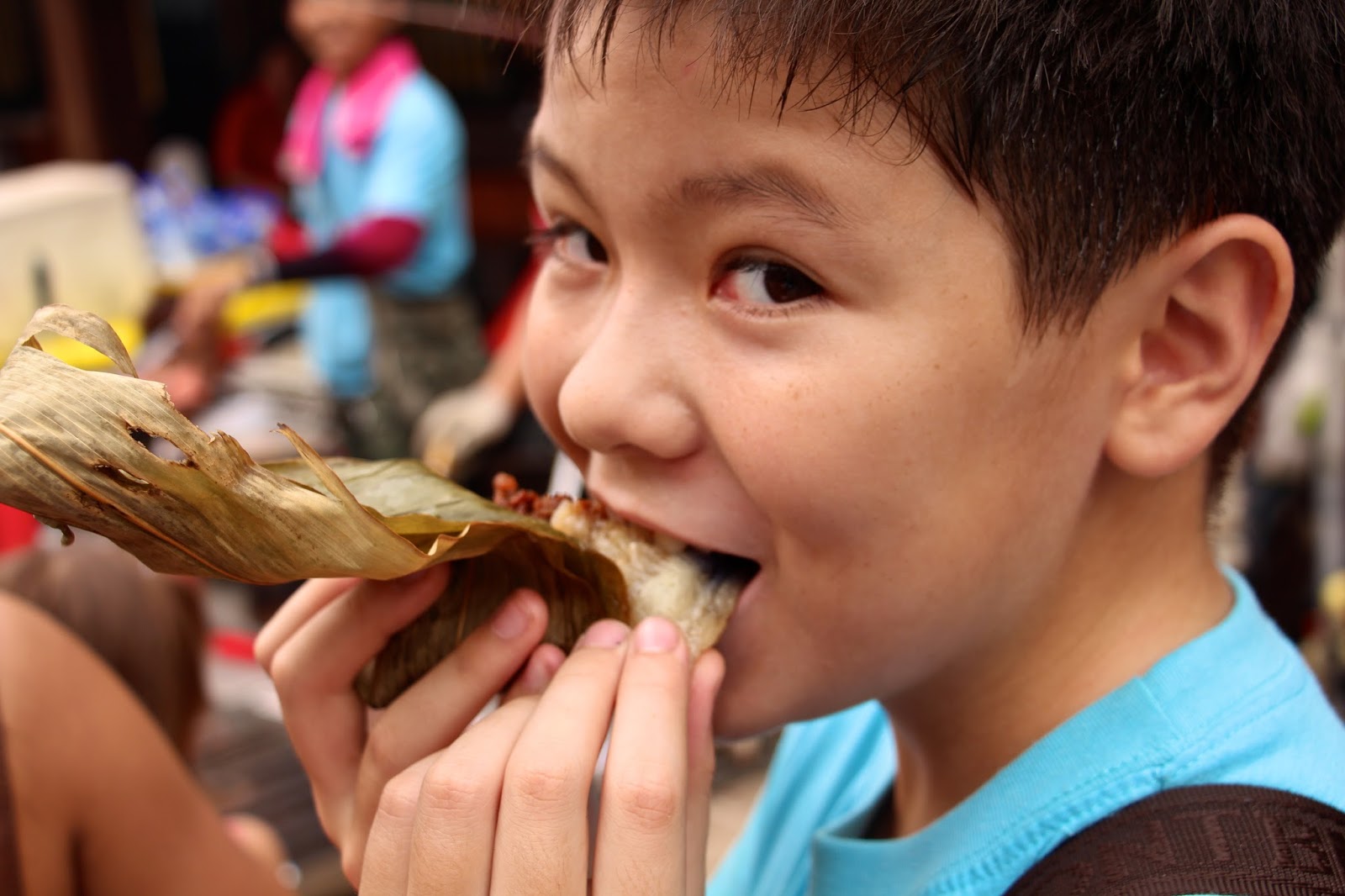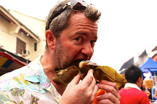 - I am tucking in to this delicious packet of pork, stick rice, banana leafy thing,