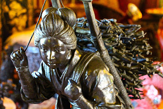 This a beautiful Japanese statue of a boy gathering fire wood.