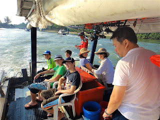 What a beautiful day we had! Left early from condo Kennett, arrived Changi Village at 8am at the fishing tackle shop, meeting Jo and family, and other friends and kids. Met by captain and deck hand and off we to board – what was in the end a bum boat (old ferry/fishing boat – renowned across Singapore) and off we went.