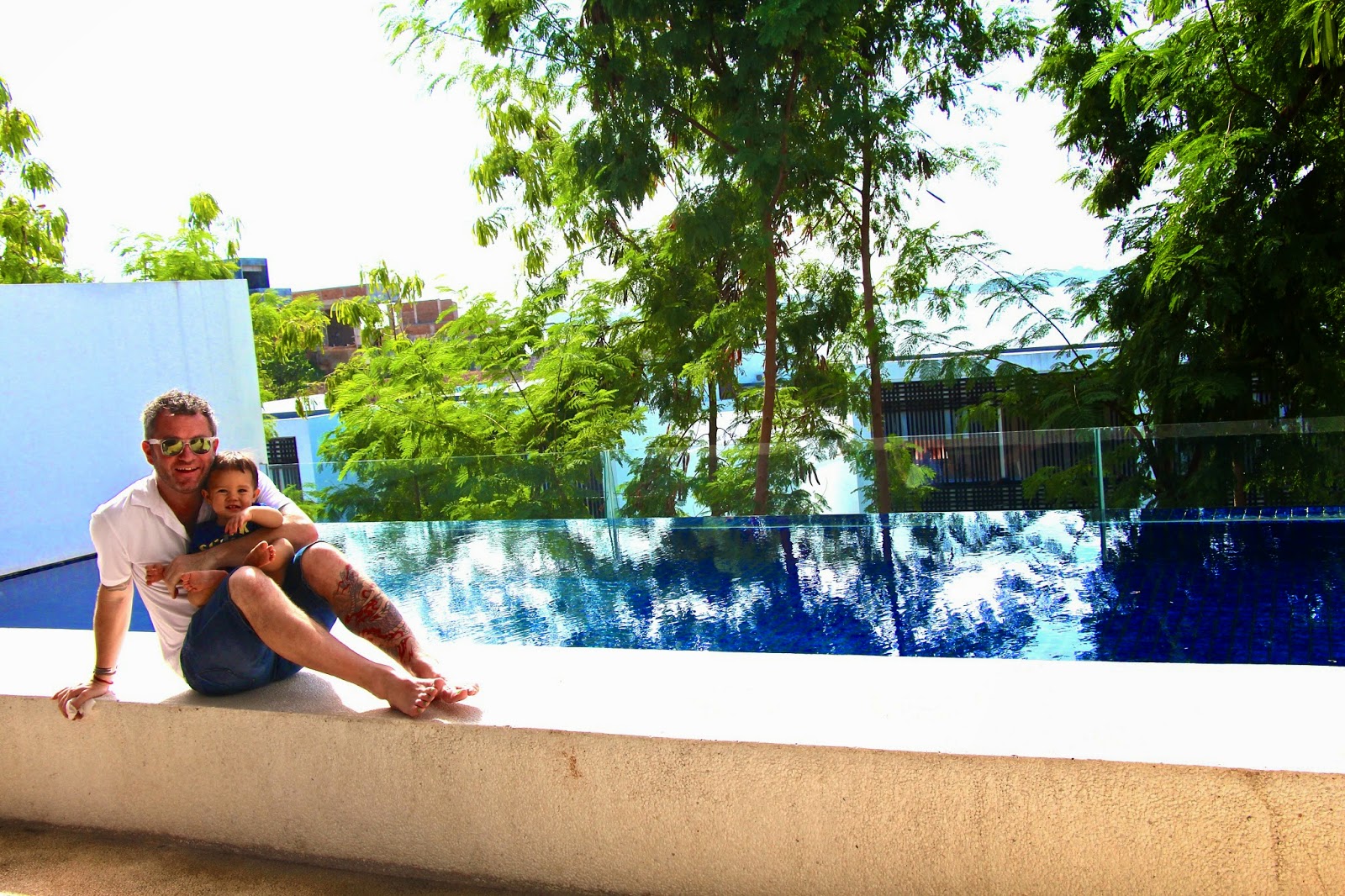 | Chilling with Baby Jude pool-side. Can you see he is absolutely desperate to get in that water!!! |