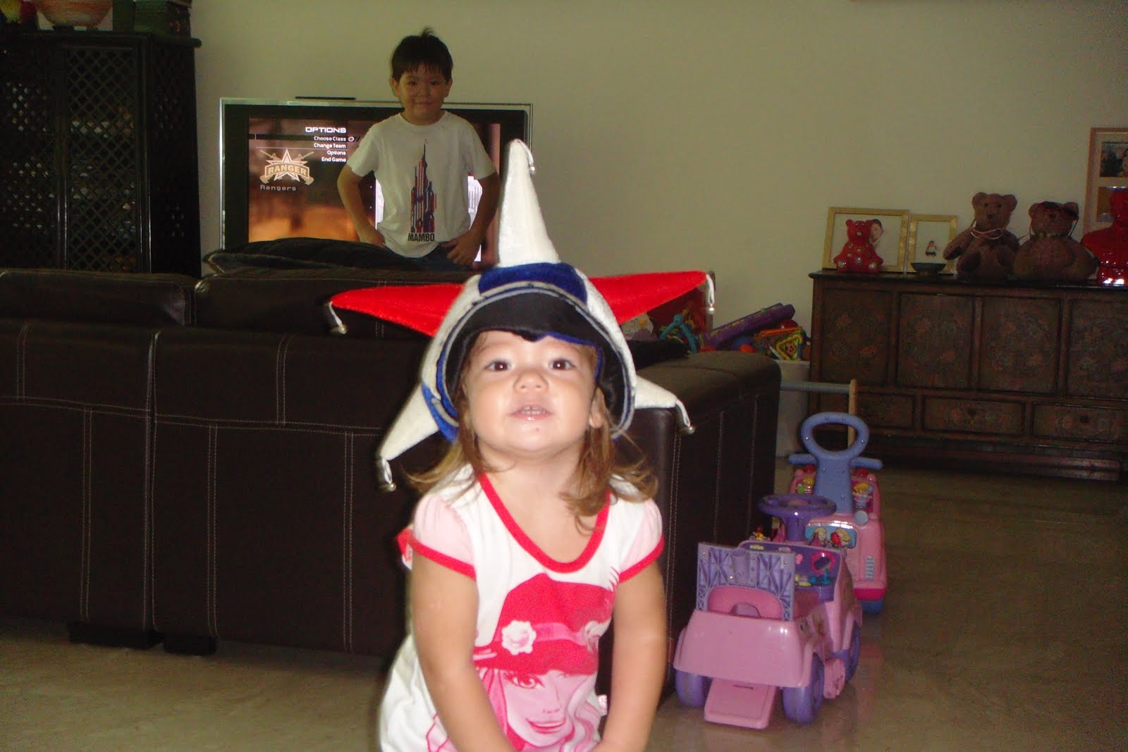 Mum yes that is the hat you bought me for birthday, yes doesn’t she look wonderful. In the background is Ollie squeezing in to a pair of shorts a little too small for him now, wey hey go Ollie. Skin tight is the new look!