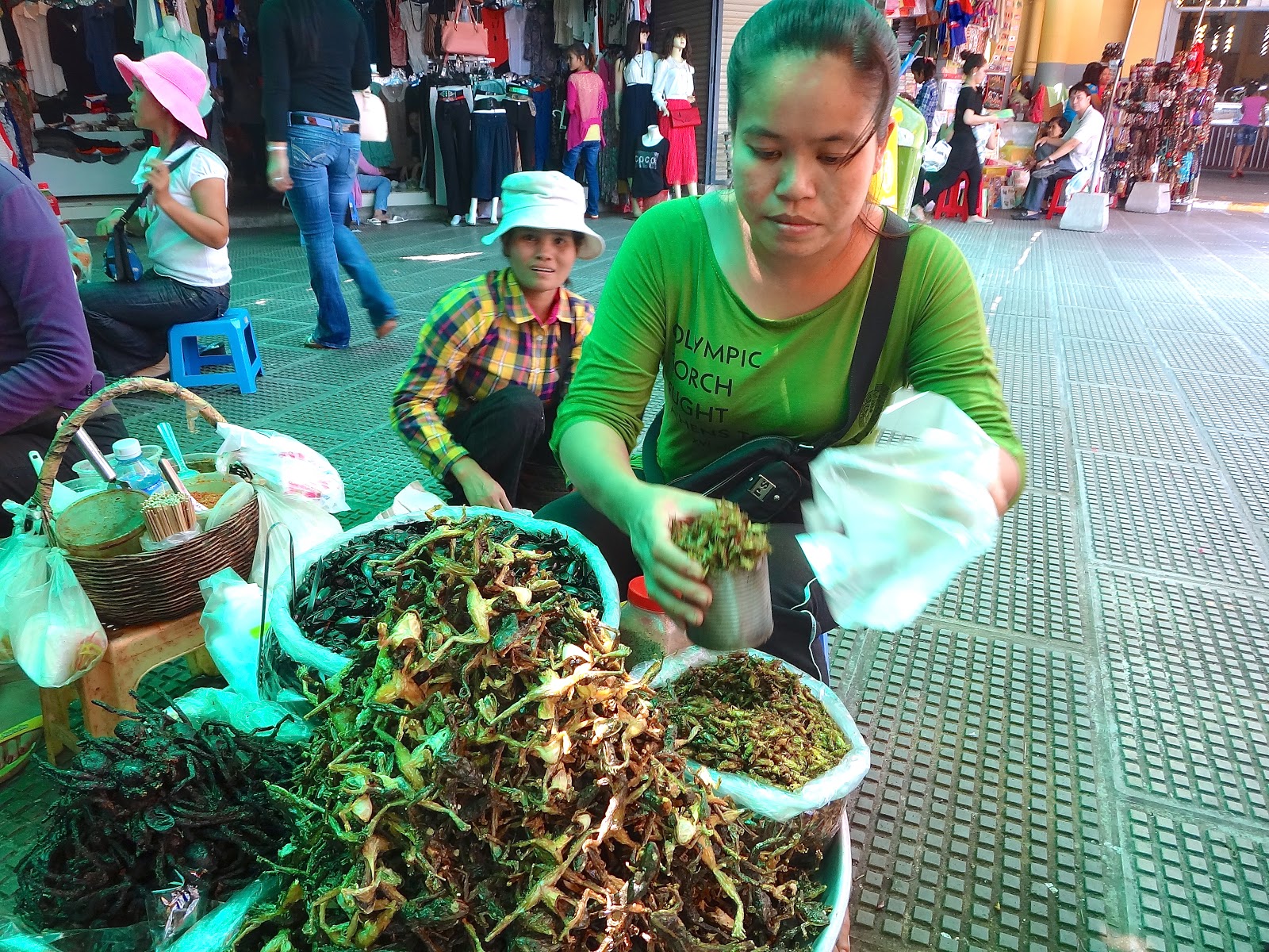 And down she goes. Leg of tarantula, lightly marinated in something or other, and fried on a stick. And I tell you what, it’s pretty nice, almost like a light teriyaki which was very surprising. I’ll have another thanks! Yep she gave me another one. Dear me eating all these spiders will I have enough room for my crickets ……….
