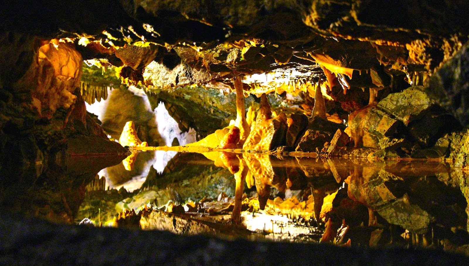 Perfectly symmetric reflections of the ceiling in the still still waters below.