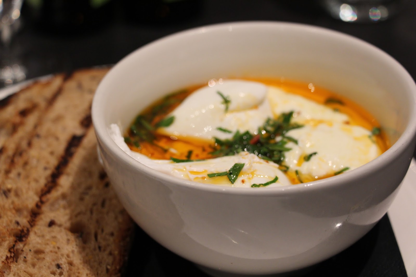 2 poached eggs, whipped yoghurt, hot chili butter and 2 slices of bread.
