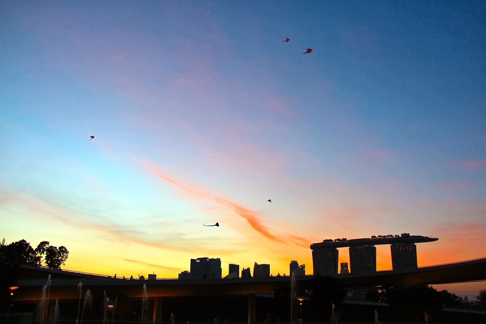 Walking back home the sun was setting. A beautiful sunset kicked in over the city skyline, and in front of that were all the silhouetted kites flapping in the evening breeze. Beautiful!