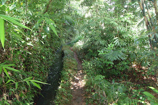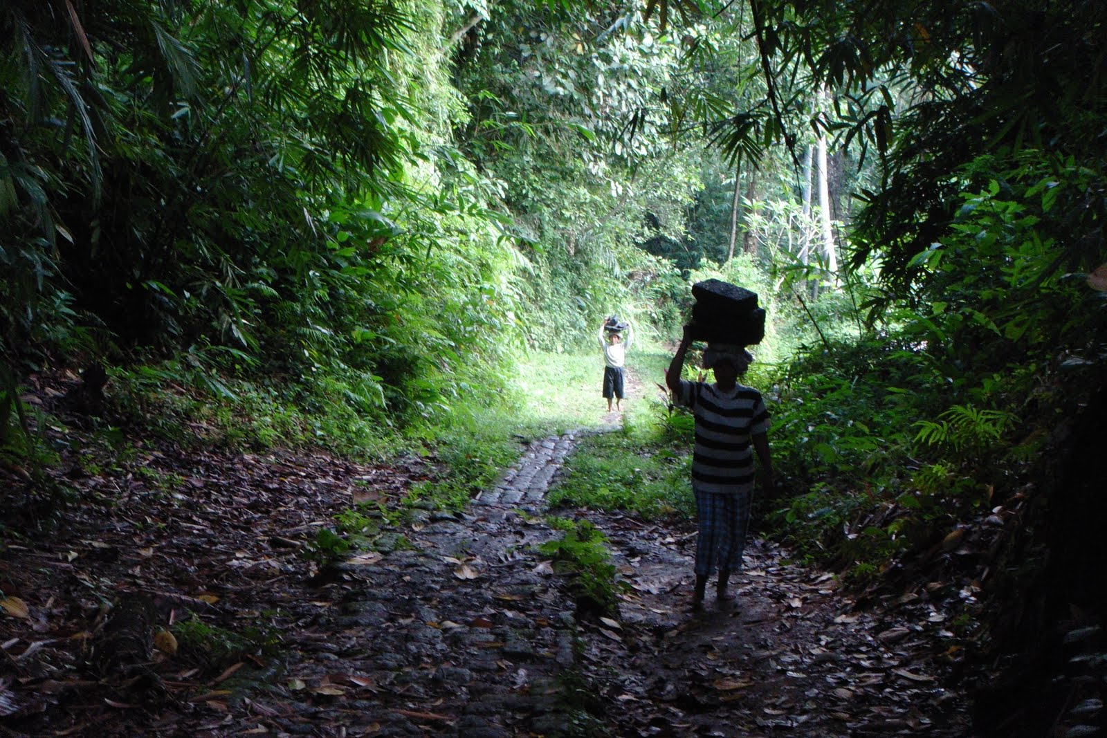 OK so they start at the top of a VERY steep hill, slippery wet with the rain from the rain forest which you’ll see below. Laid with stone steps to make it easier, but worn down after generations doing the same thing that they are very slippery and wet. Down they go to a flat bit, along a little river, then to a set of steps which is like climbing down a vertical ladder. Then they reach the river at the bottom of the gorge they have just climbed down, along the river to the waiting man who is doing the cutting of the rock from the river bed.