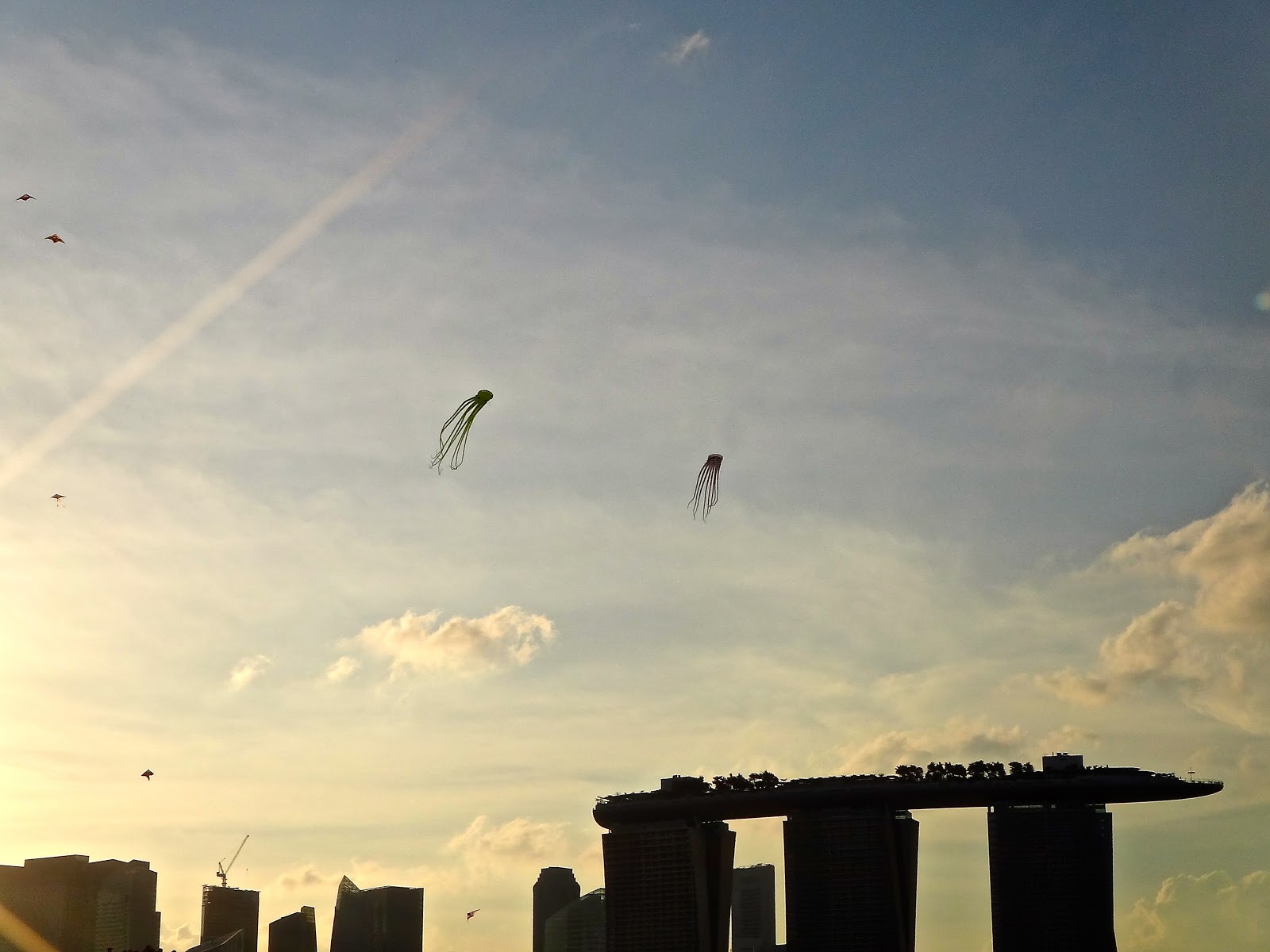 As we near the barrage. What the hell are these things in the skies. Here they are looking back over the Marina Bay Sands Hotel. Strange shapes, floating high up in the sky. Almost like large jelly fish – but in the sky ……..?