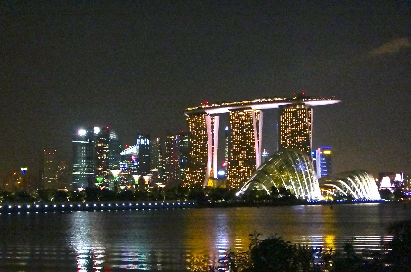 We all walk up to be on the roof top now, nothing at all above and the view is as below. How bloody nice is that. It’s breath-takingly beautiful. Seriously could sit here ALL night soaking in the views. Amazing. The domes of the Gardens, the Flier, the gardens, the other trees, the F1 starting lane and pits tonight with a go-kart race on, the river and even our condo. Beautiful!