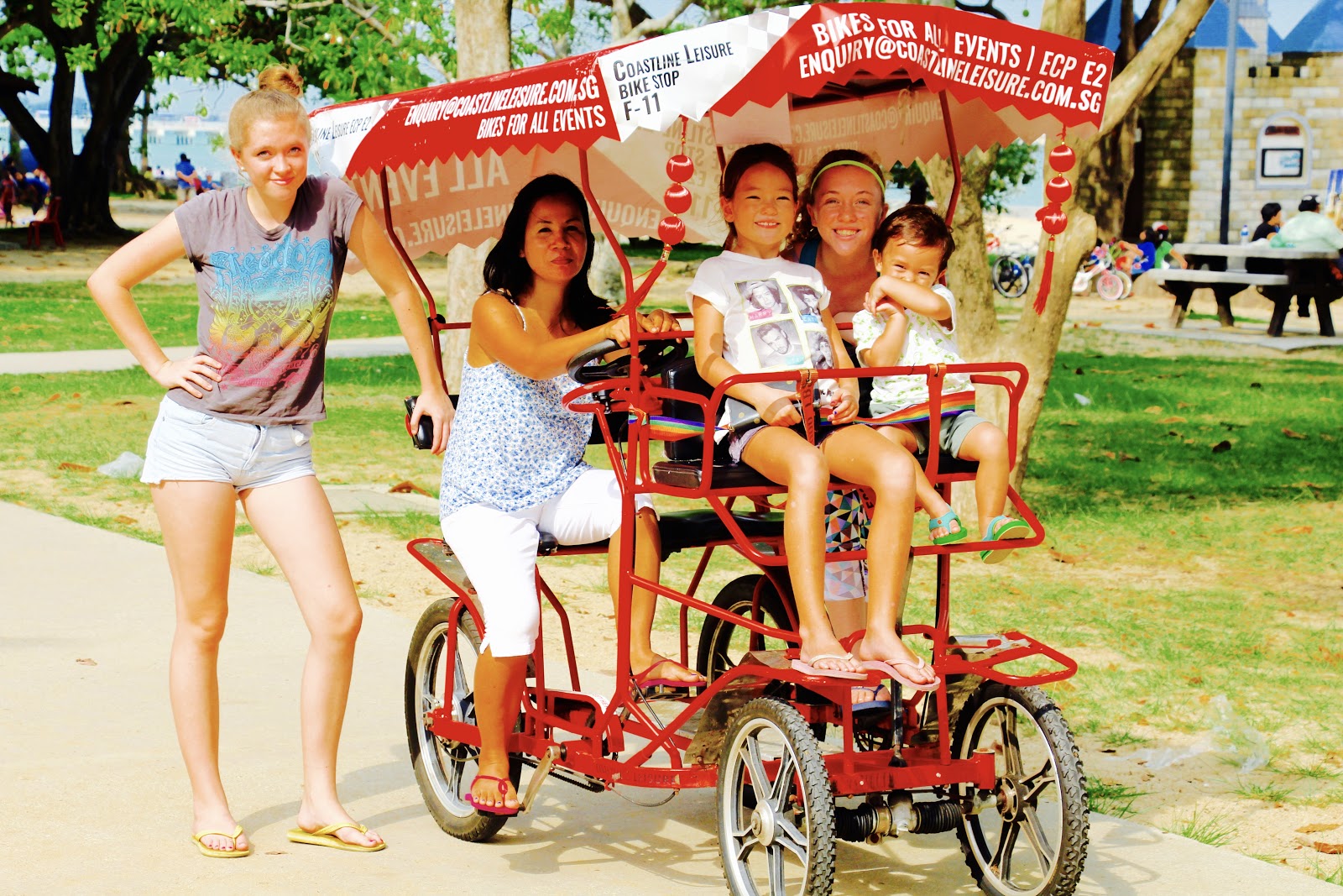This weekend was boiling – so let’s get the scooters out and go for a walk to East Coast Park, and Lagoon for lunch. Met with our mates The Rutherford’s, Blowers, Wills and more. What a lovely day it was. Jude on the beach for hours until he got bored and then hiring the BIG bike for the guys to cruise up and down. Some new dishes from our local.