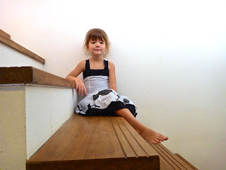 Amy sat on the stairs from the living room in her new (that she chose) dress, very beautiful babe.
